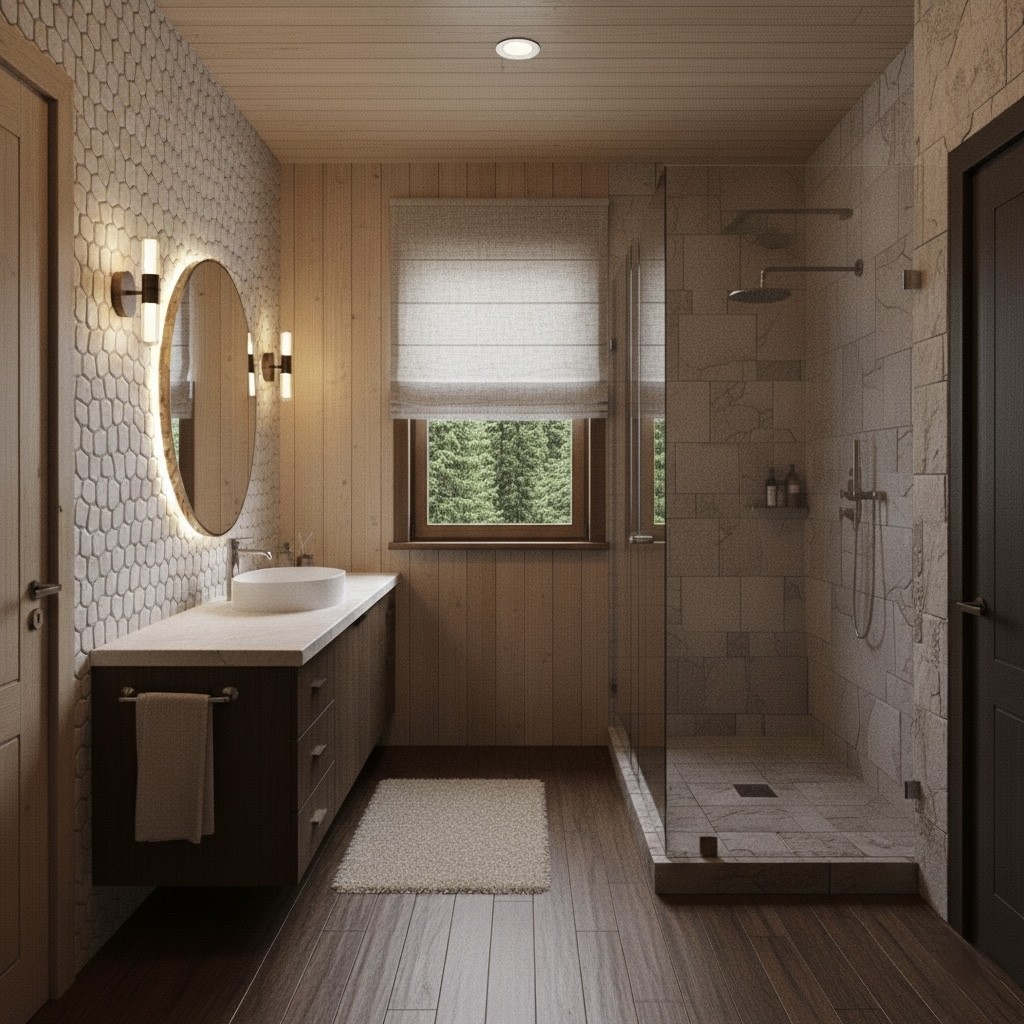 The bathroom design on the other hand, combines modern and natural elements. Natural light from its large window brightens the space, while wood and stone textures give the bathroom a spa-like ambiance.