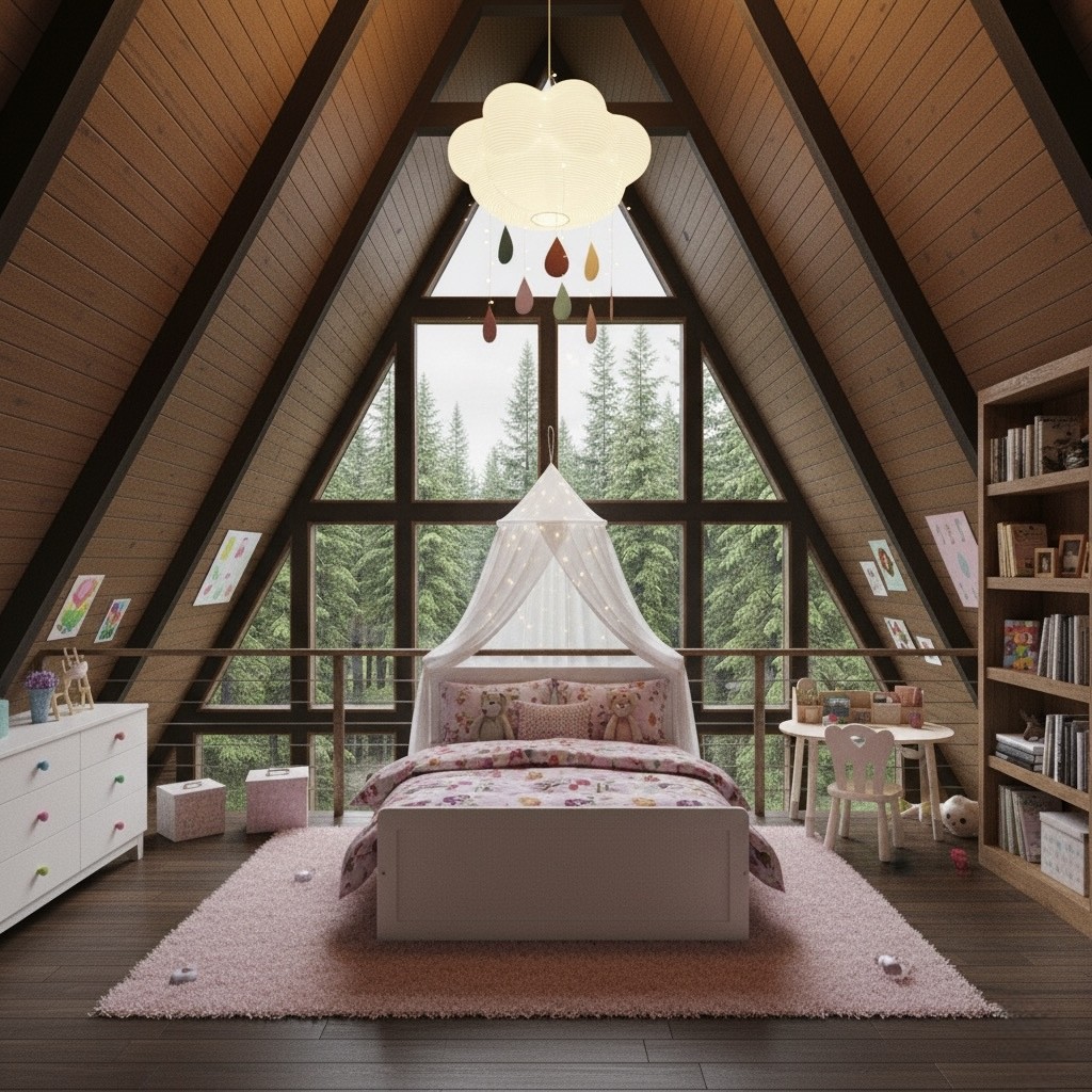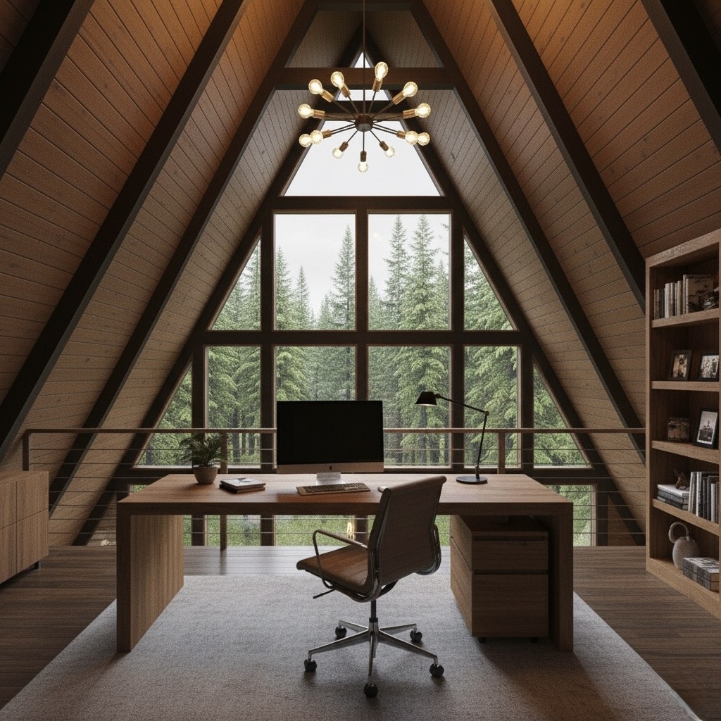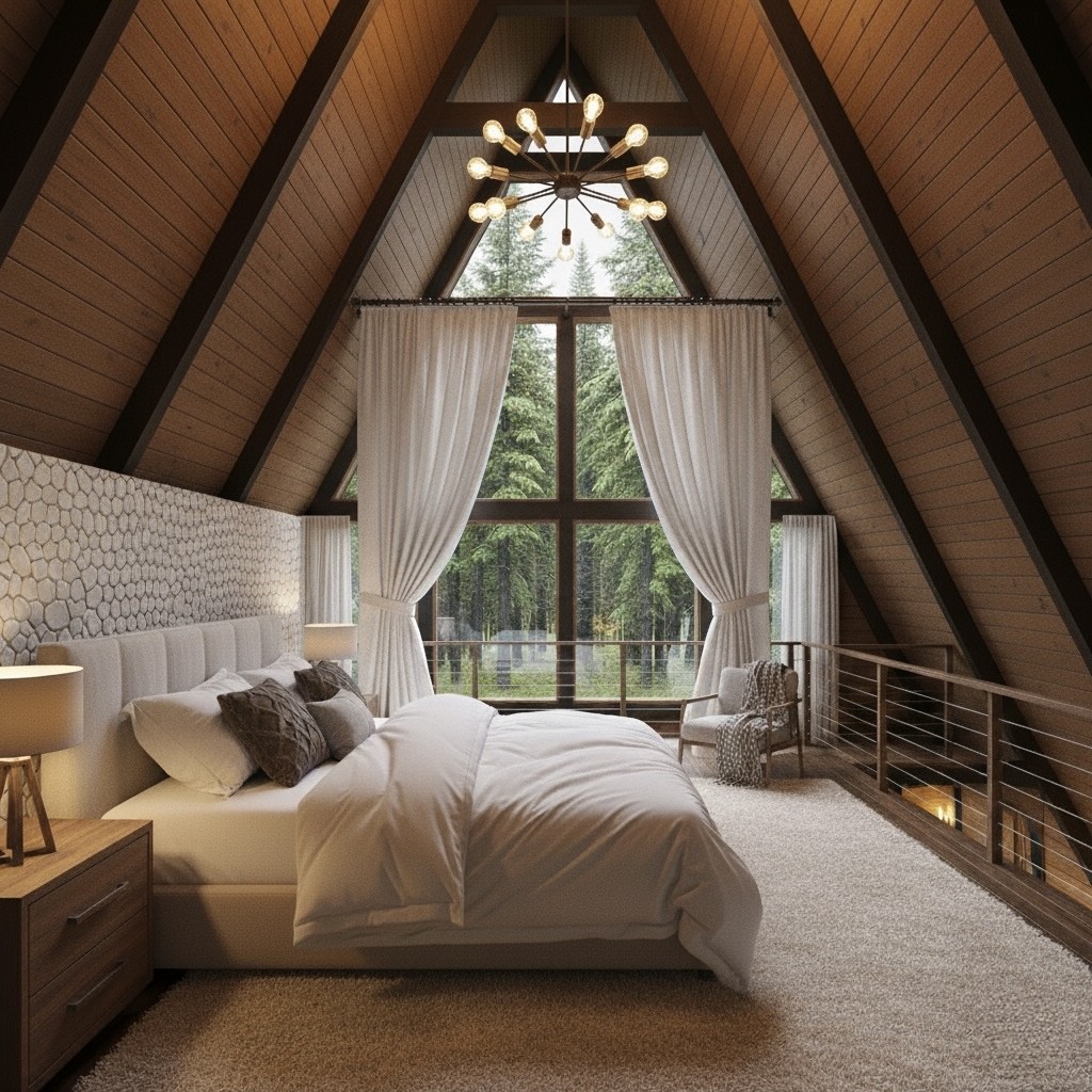 The bedroom promises a peaceful sleeping experience. The bed’s position is thoughtfully placed to directly capture the light and views from the prominent triangular window, a key feature of A-frame homes. The elegant ceiling lamp and curtains on the sides add both aesthetic and functional touches to the room.