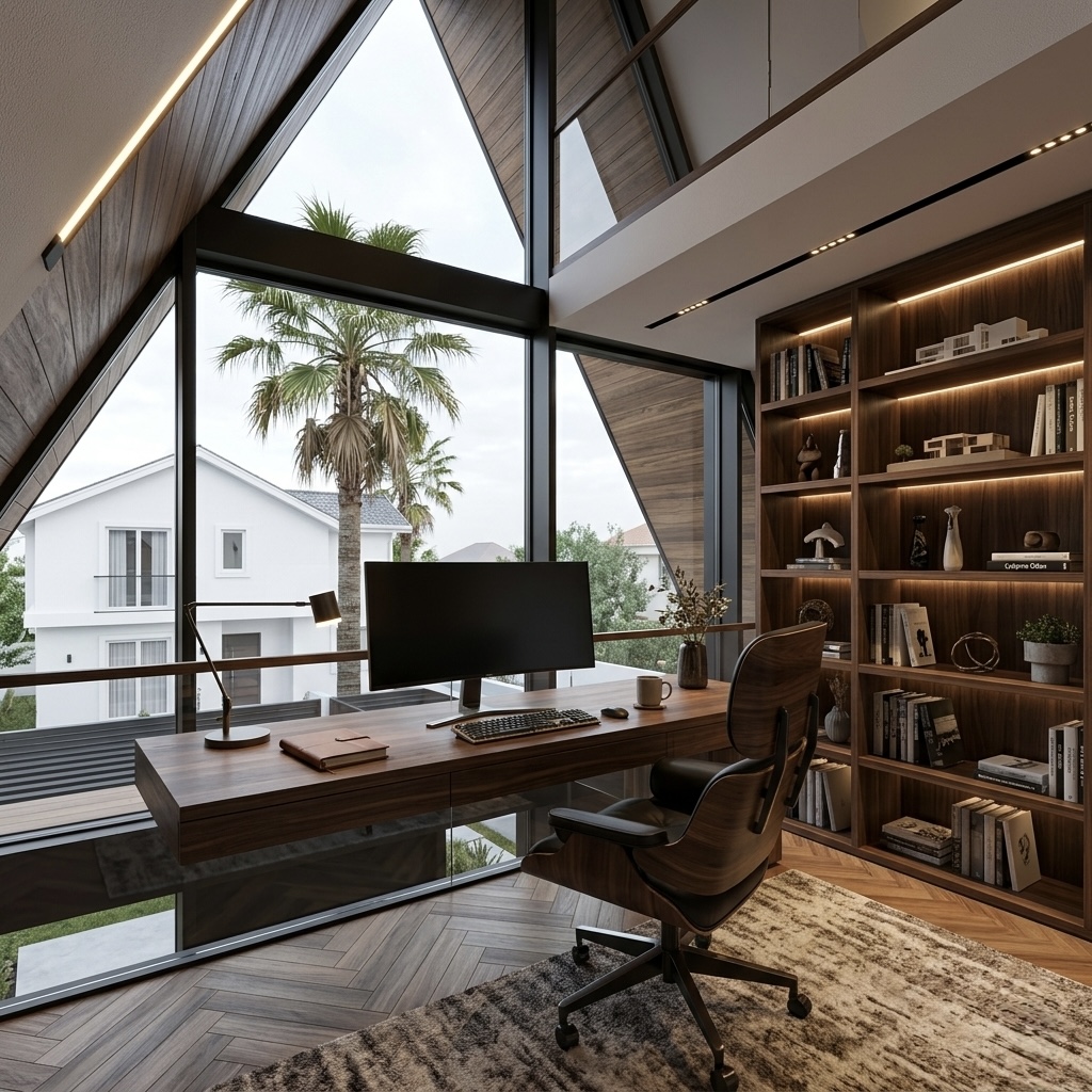 • The Ultimate Home Office: A loft-style home office utilizes the highest peak of the house. A cantilevered desk facing the glass wall provides an inspiring workspace, complemented by backlit bespoke shelving.